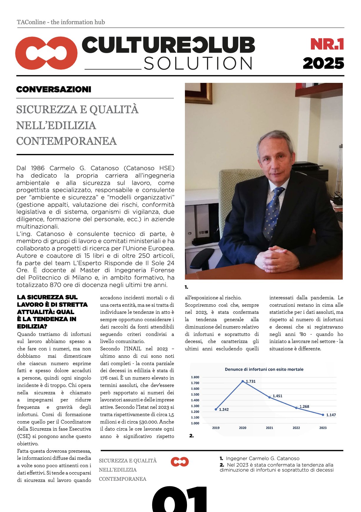 Con questo primo fascicolo CULTURE CLUB_SOLUTION si apre un ciclo di approfondimenti “tecnici” connessi alla formazione professionale sviluppati in collaborazione con h25 (centro di formazione accreditato per ingegneri, architetti p.c.c., geometri e periti industriali specializzato nell’organizzazione di eventi in collaborazione con Aziende, Ordini e Collegi professionali). Consulente tecnico di parte, l’Ing. Catanoso è membro di gruppi di lavoro e comitati ministeriali e ha collaborato a progetti di ricerca per l’Unione Europea. Autore e coautore di 15 libri e di oltre 250 articoli, fa parte del team L’Esperto Risponde de Il Sole 24 Ore. È docente al Master di Ingegneria Forense del Politecnico di Milano e, in ambito formativo, ha totalizzato 870 ore di docenza negli ultimi tre anni. Con lui, in questo fascicolo abbiamo approfondito alcune tematiche relative al tema della “sicurezza e qualità nell’edilizia contemporanea”.