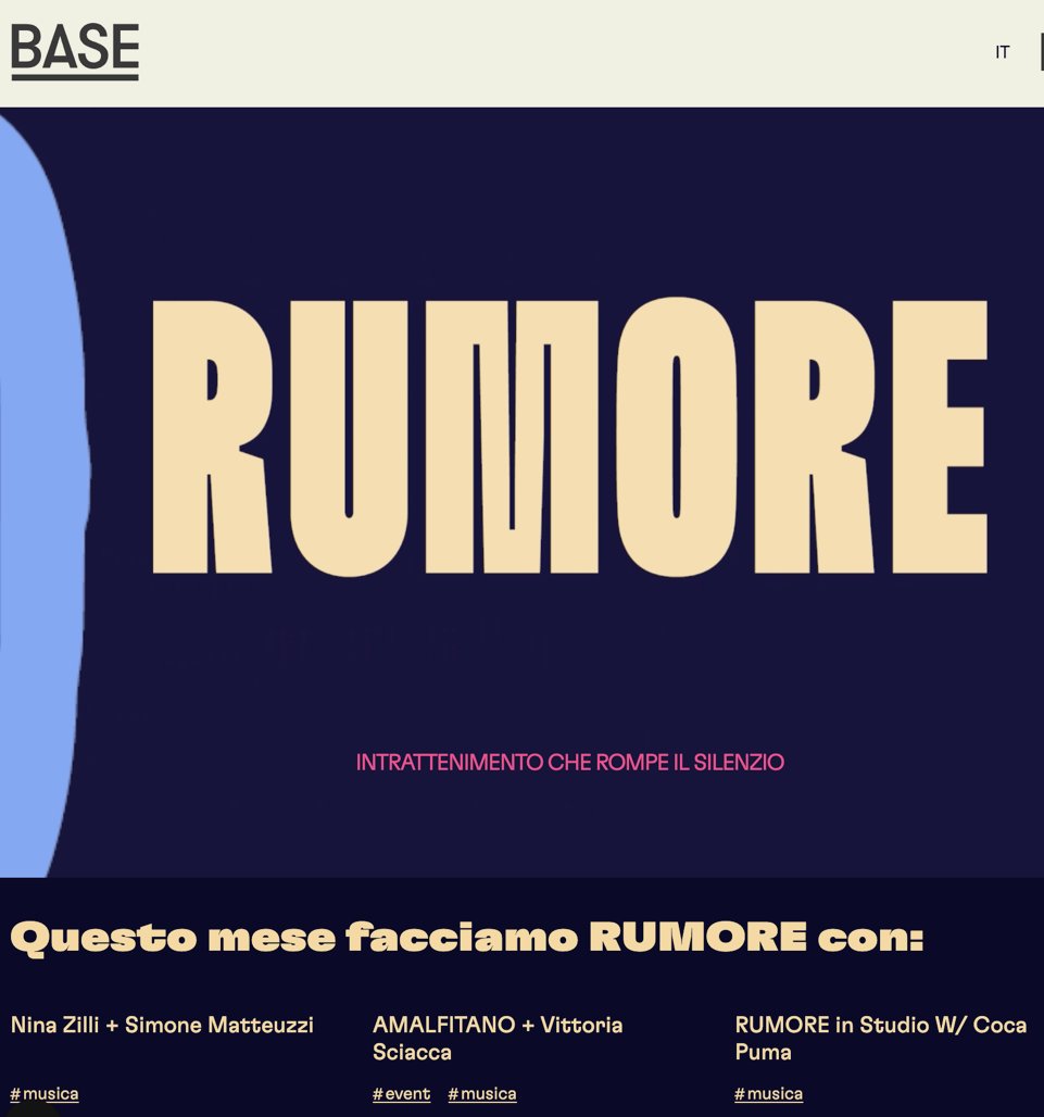 BASE Milano presenta la terza edizione di RUMORE, il suo programma musicale 2025 con talenti emergenti e nomi affermati della scena musicale italiana e internazionale, e si conferma come luogo di sperimentazione e incontro, un posto dove stare e creare. Fino alla primavera 2025, la rassegna porta sui palchi dentro e fuori da BASE Röyksopp, POPA, Nina Zilli e Simone Matteuzzi, Coca Puma, Marta Del Grandi, Any Other, Acid Arab, Sofia Kourtesis + Velasco, Nicolò Carnesi e Cordio, Amalfitano e Vittoria Sciacca, Napoleone e Carla Fucci, Partiboi69.