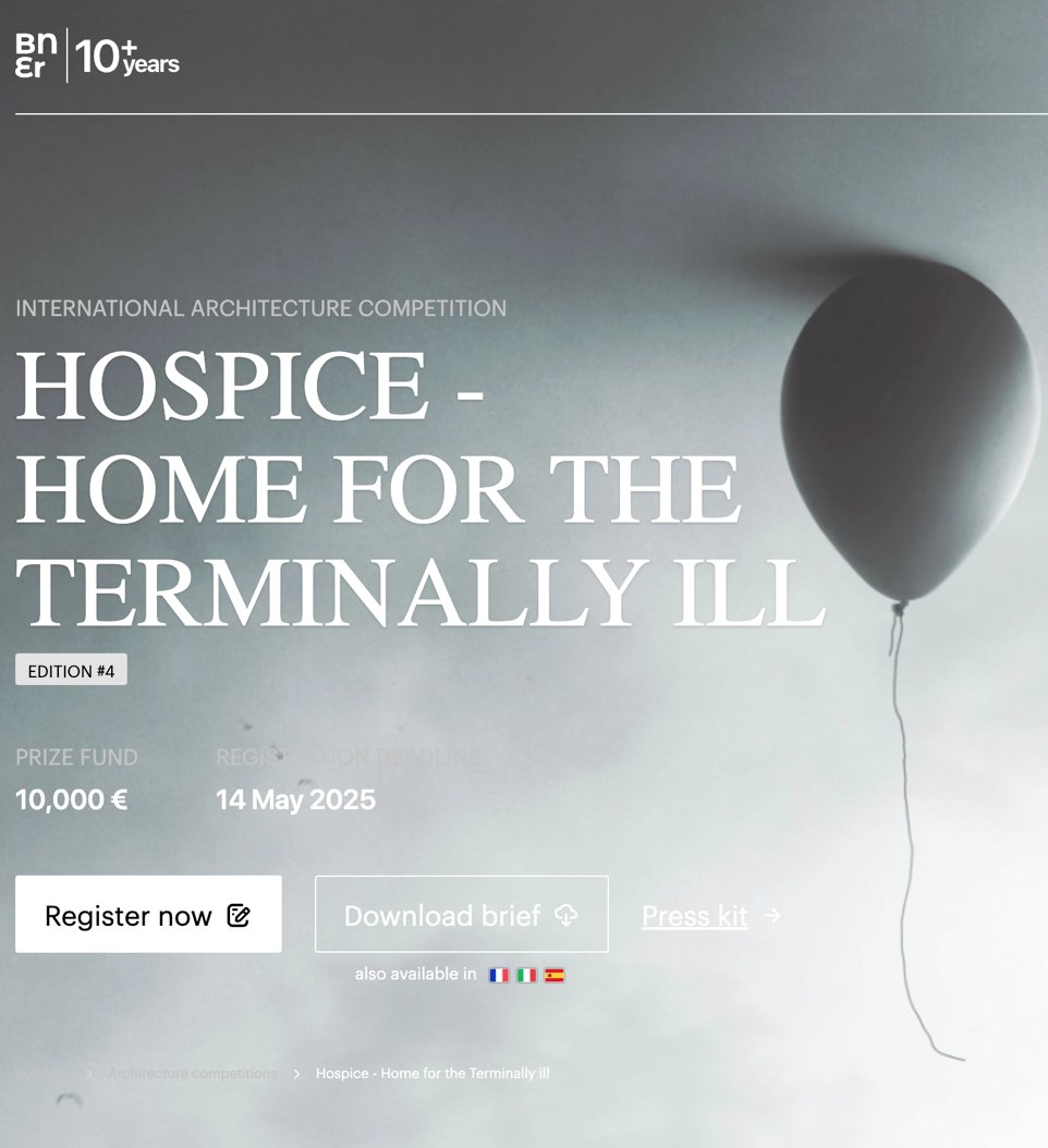 Il concorso “Hospice – Home for the Terminally Ill”, è arrivato alla quarta edizione. Il concorso per idee architettoniche è dedicato alla progettazione di ricoveri per persone affette da malattie terminali. Aperto a tutti, senza qualifiche professionali, accetta la partecipazione sia di individui sia di gruppi di progettazione. La scadenza per la registrazione è il 14 maggio 2025.